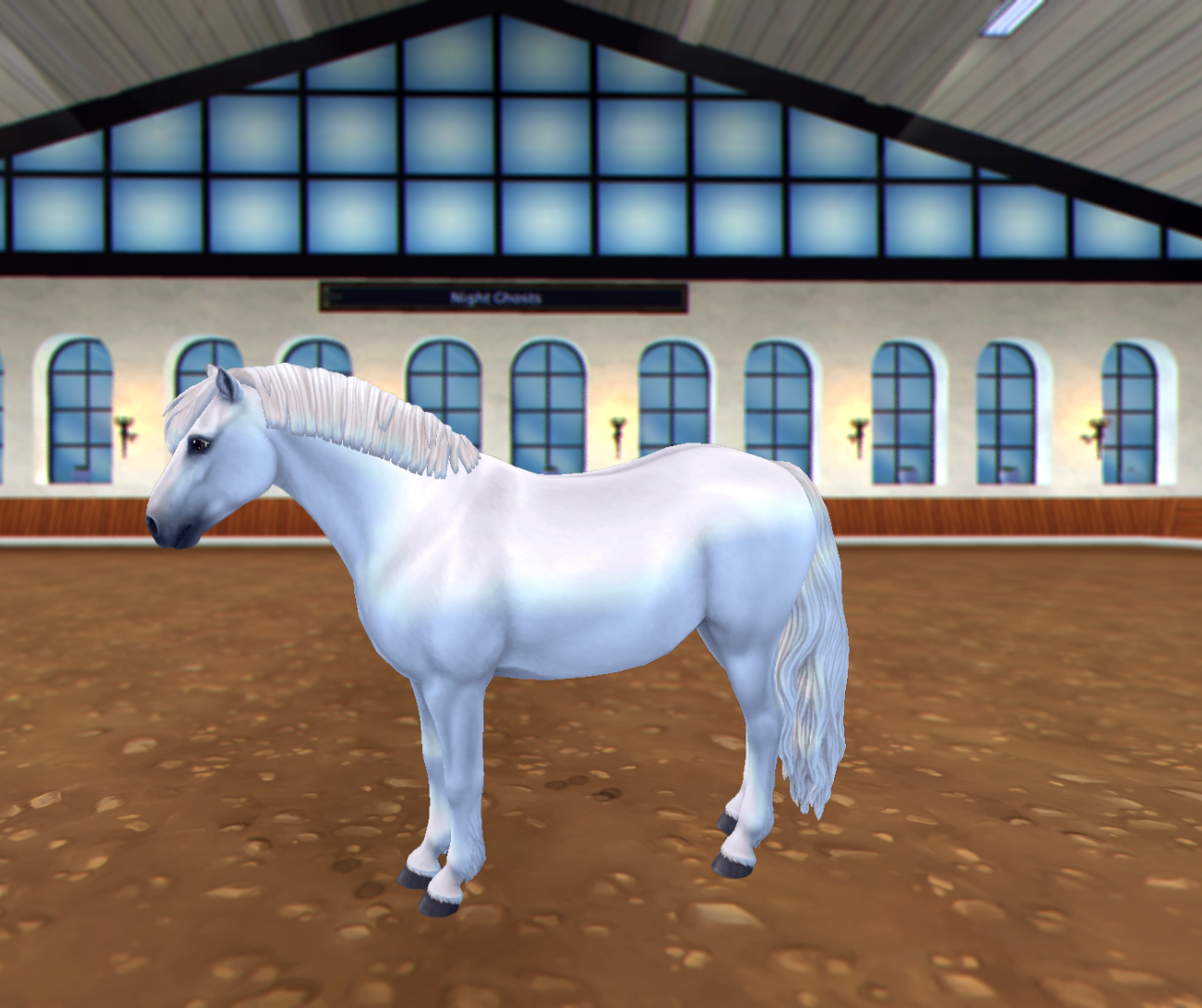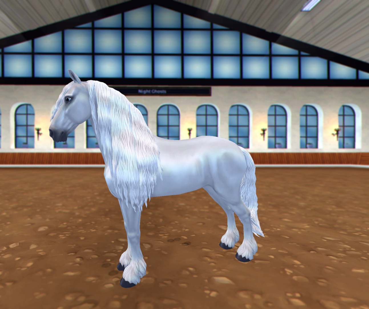 Night Ghosts klubbhäst, är en vit Frisisk Sporthäst i gen 3. Du kan köpa den för 950 SC & står vid Medeltidslägret. Det ska vara originalmanen.